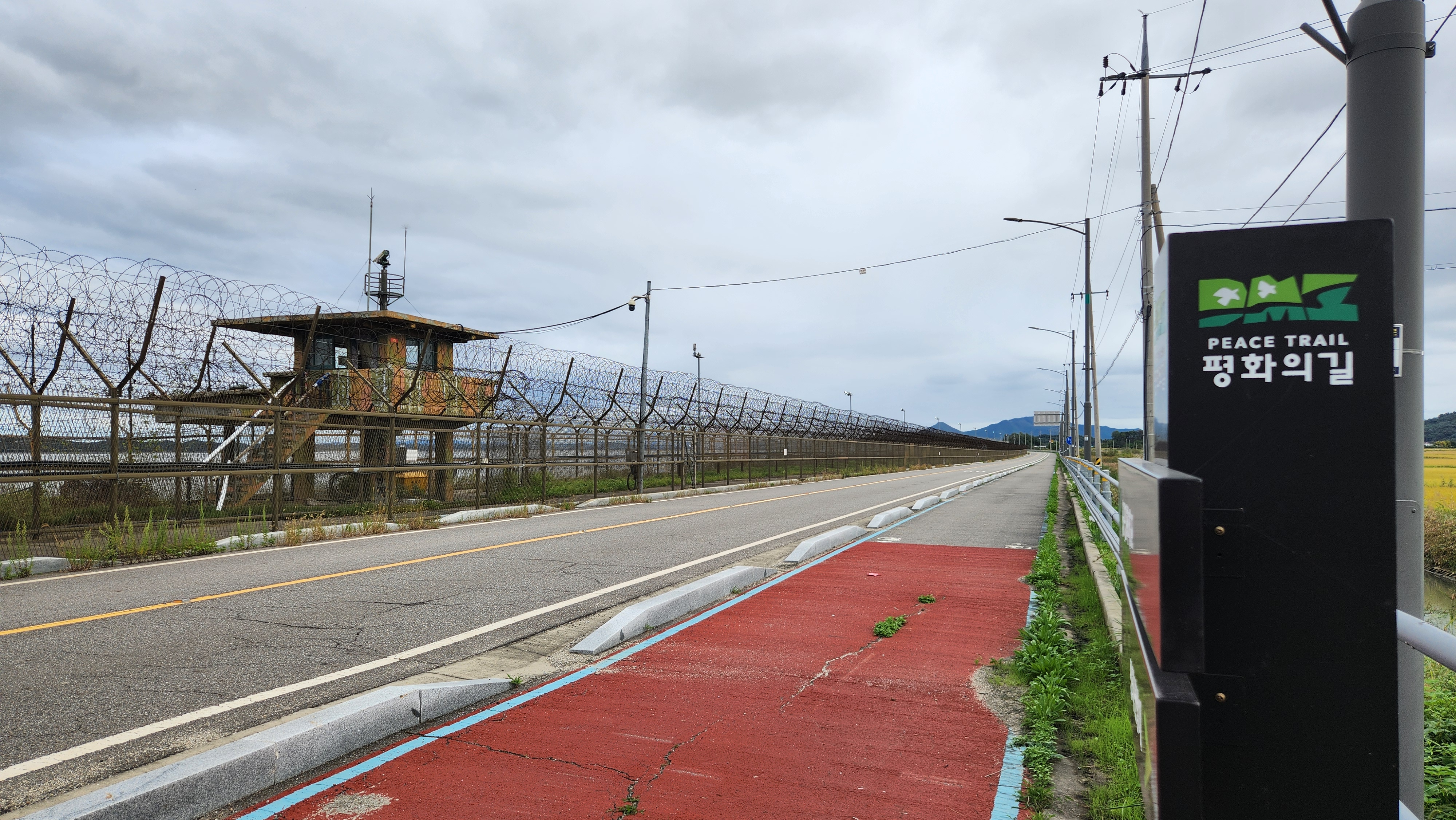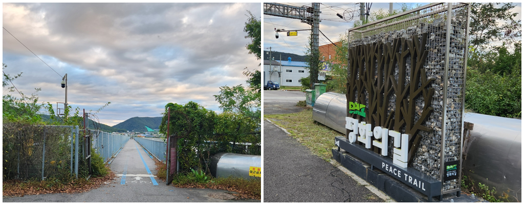 1코스는 대부분 강변을 따라 철책이 세워진 길을 따라 걷는다. 철책 너머 강 건너편이 북한이다. 아이러니하게도 분단으로 나뉜 경계선에서, 군인이 경계를 서고 있는 군사지역에서 평화와 안전의 분위기를 느낀다. 살벌함은 없다. 남북의 평화와 통일을 기원하는 의미에서 'DMZ 평화의 길'이라 명명하였겠지만 실제 평화가 충만한 느낌이다. 전국 어느 길보다 고요하고 평온하다. 사람들 간의 다툼도 경제적 이해관계에서 비롯되는 갈등도 느껴지지 않는 순수함이 길에 묻어난다. 분단으로 나뉜 경계선의 철책을 따라 호젓이 들과 강과 하늘을 보며 길을 걷는 것은 아픔의 상흔 위에서 받는 위로이다. 전 세계 어디에도 이런 길은 없을 것이다. 전쟁 위협은 운운은 정치적 수사일 뿐 아닌가? 언제나 권력과 정치가 비극을 불러왔다. 민중은 평화를 사랑할 뿐이다. 한동안 시끌했던 대남대북 방송은 꺼졌고 자유롭게 비행하는 철새소리만 들릴뿐이다. 고요하다.