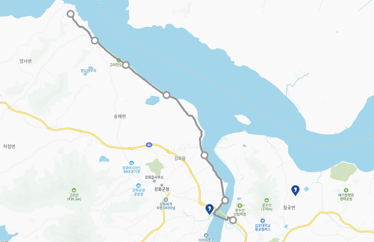출발 후 약 4km가 안되어 고려천도공원이 나온다. 고려천도공원은 고려 고종이 몽골의 침략을 피해 강화도로 천도(1232년 7월 7일)할 당시 어가 행렬이 닿았던 역사적 장소인 승천포(옛 지명)를 배경으로 조성된 공원이다.