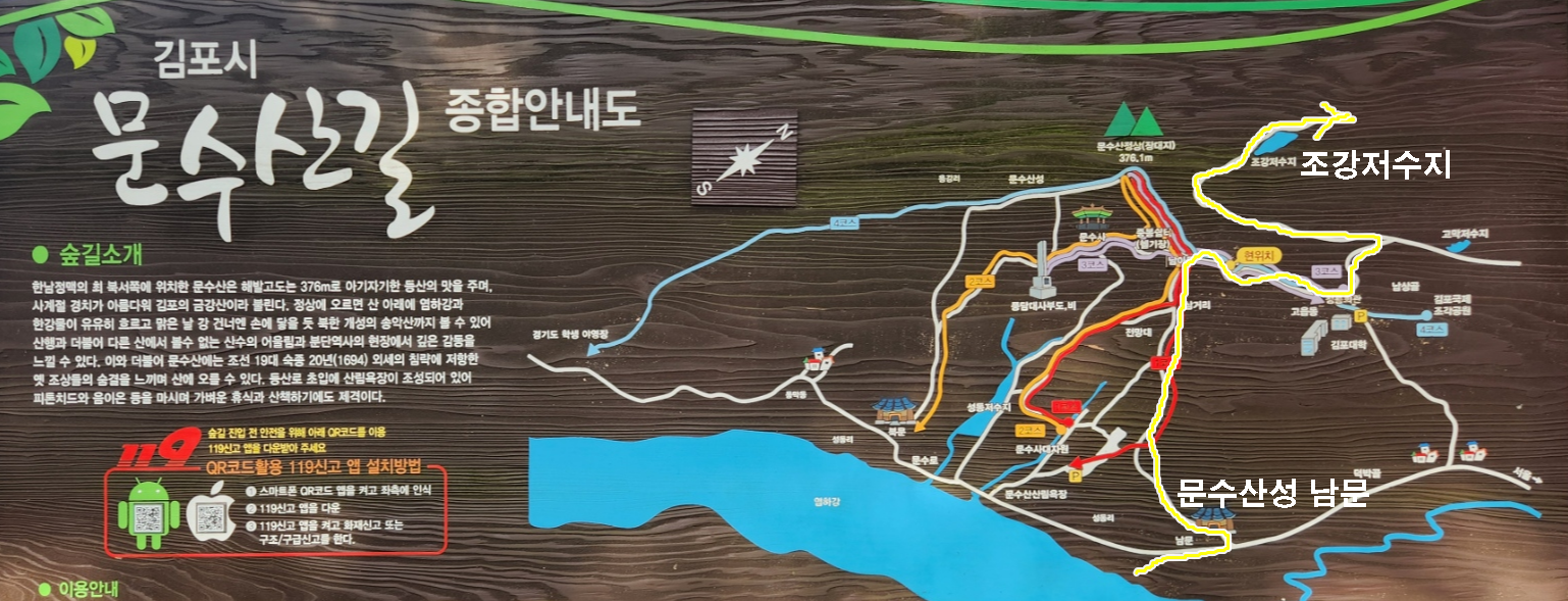문수산성은 경기도 김포시 문수산에 있는 조선 후기 산성이다. 1694년(숙종 20)에 강화도의 방비를 위해 쌓았다. 1866년 병인양요 당시 프랑스군과 전투가 벌어진 역사적 현장이기도 하다. 문수산 정상부에서는 삼국~통일신라시대에 쌓이고 운영된 성벽이 발굴되어 조선시대 이전부터 이곳이 군사 요충지였음을 알 수 있다.(출처:한민족문화 대백과사전) 성곽은 잘 정비되어 있다.