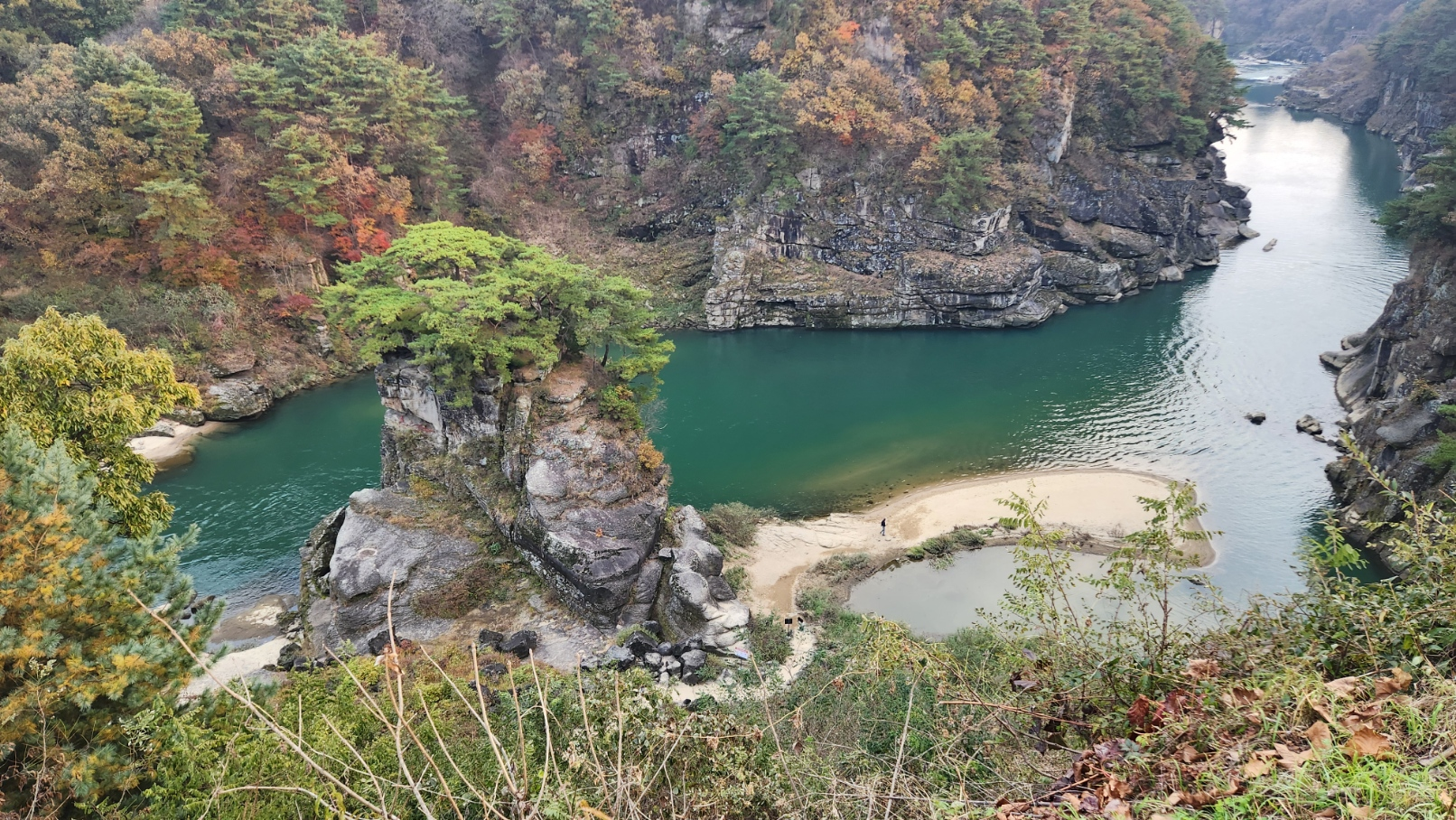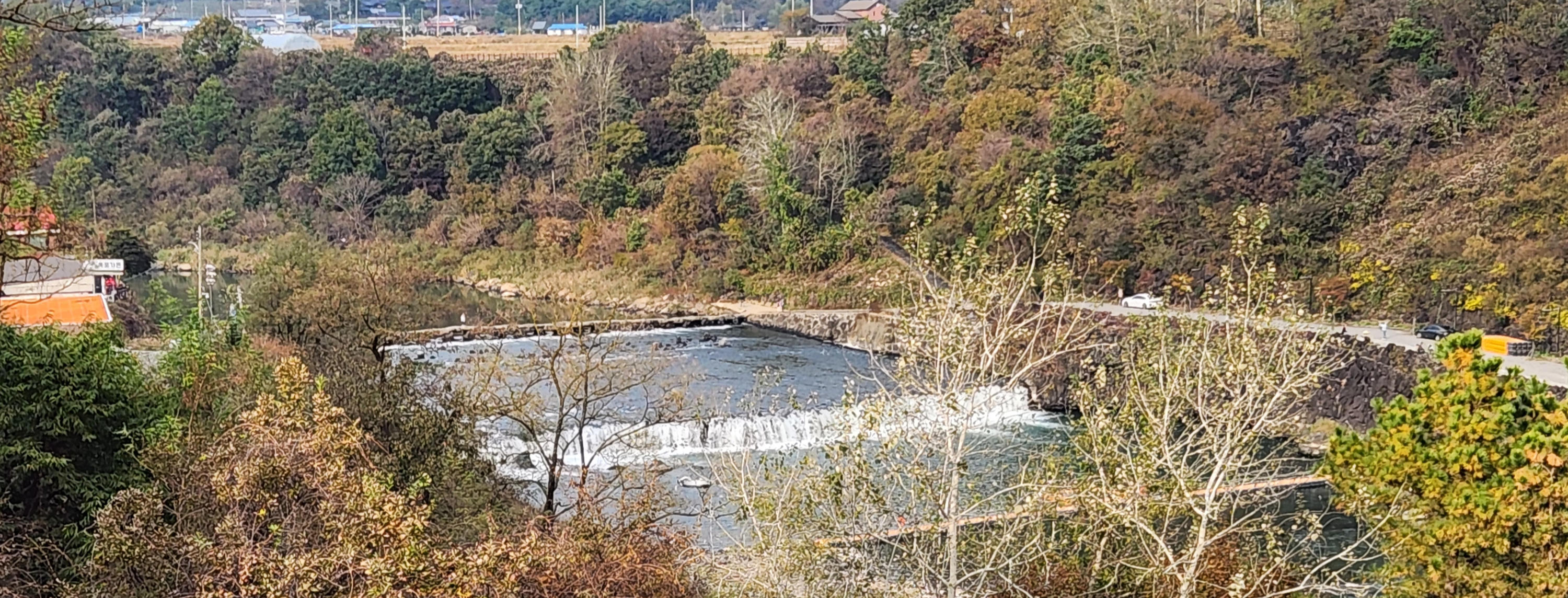 송대소 주상절리와 한탄강 부교, 그 뒤로 은하수교 주탑과 전망대가 보인다. 부교 위를 걷는 관광프로그램이 있는데 비싸기도 하거니와 코스에서 강 아래로 내려가야 하기 때문에 위에서 감상만 했다. 코스인 줄 착각해서 은하수교를 건넜는데 좀 아찔하다. 확실히 늙었다는 증거다.
