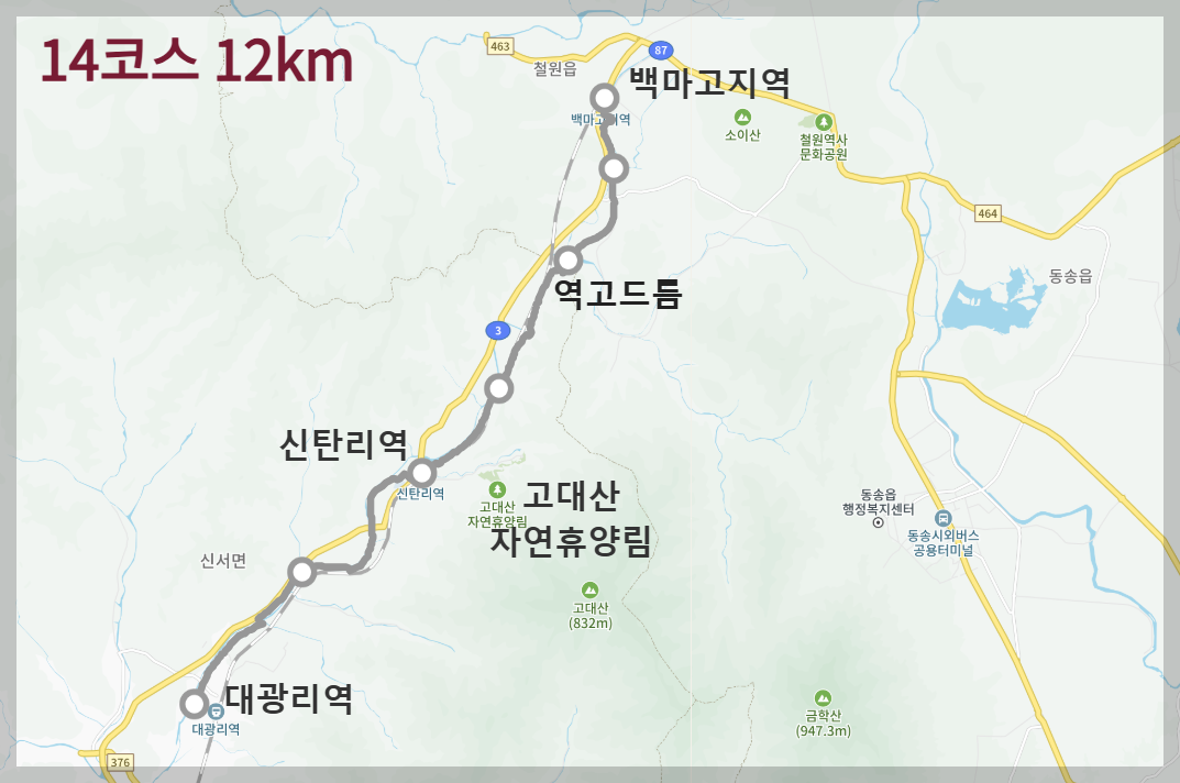 평화의 길 14코스는 대광리역에서 백마고지역으로 이어지는 기찻길을 따라 이동하는 길로 길이가 12.0km이고 약 4시간이 소요되는 난이도 '쉬움'의 길이다. 1914년 8월 14일 완공한 경원선 철도를 따라 걷는 코스로 6.25 전쟁의 상흔이 곳곳에 남아있는 역사문화자원이 많은 구간이다.