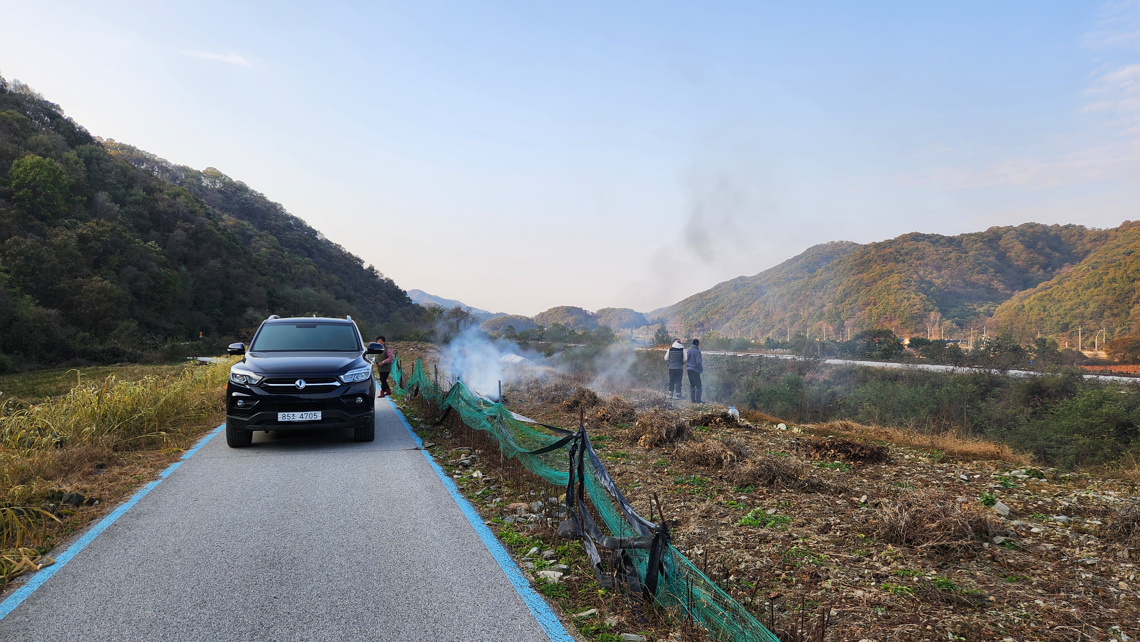 부부가 외국인 근로자 둘을 데리고 밭에 일하러 나왔다. 지나가며 인사를 하니 불을 쬐고 가라 하신다. 그렇지 않아도 불내음이 참 좋았는데 그 말에 성큼 밭으로 들어가 모닥불 옆에 섰다. 고대산에 가려 아직 밭에는 햇살이 들지 않는다. 할머니(?)는 손이 시려 일을 시작하기 어려워 불을 피웠다고 하면서도 불안해한다. 요즘은 소각을 하거나 들에 불을 놓고 있는 현장이 신고당하면 낭패를 본다. 평화의 길 걷기를 하면서 사람이나 차량을 볼 수 없는 외로운 길에서도 가끔 볼 수 있는 인기척은 지역에서 운영하는 산불 감시 차량이다.