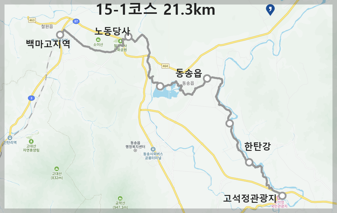 15코스(백마고지역에서 두루미평화타운까지 19.4km)는 16코스 예약이 되지 않으면 진입하지 않아야 한다. 16코스(두루미평화타운에서 도창리검문소까지 21.2km)는 민간인 통제구역으로 예약노선이다. 16코스 예약을 하지 않거나 할 수 없다면 15-1코스를 이용하여 곧바로 고석정까지 가는 편이 적절하다.