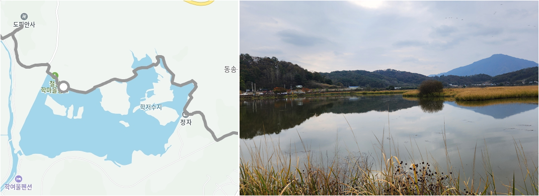 도피안사를 지난 얼마 후 '학저수지'를 만난다. 학저수지는 철원군 동송읍 오덕리에 위치한 저수지로 학이 많이 산다고 하여 붙여진 이름이다. 1921년 일제가 설비하였다.